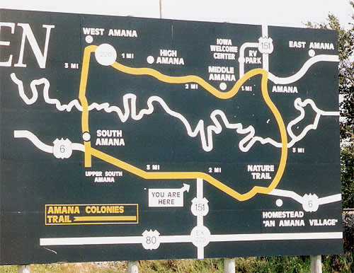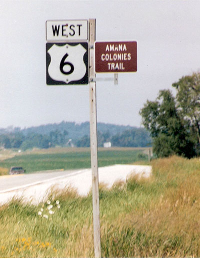 Route 6 meanders through some scenic territory while passing by two of the Amana Colonies, South Amana and Homestead. The seven Amana villages were part of a communal society for decades after originally being settled by German Pietists in 1855. In recent times Amana has been better known for the manufacture of appliances and for various tourist attractions. (August 2004 photos)