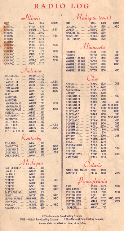 Auto-Owners Mutual Insurance Company published this radio station list with its 1939 highway map of Michigan, Indiana, and Ohio. The number of automobile radios had increased dramatically during the late 1930s, and suddenly road maps listed stations. AM only; FM radio was in the future. Note the networks listed: ABC was not started until 1945 after it took over one of NBCs two networks, the Blue Network. |