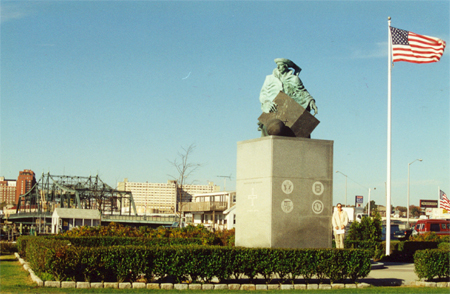 Route 6 passes through numerous towns and regions that maintain strong ethnic traditions. This part of New England was the destination for large numbers of Portugese immigrants in both the late-nineteenth and the mid-twentieth centuries. On Popes Island, between New Bedford and Fairhaven, is a monument "dedicated by the government of Portugal and the Prince Henry Society of Massachusetts, Inc., New Bedford Chapter, to all immigrants who left their homeland to come to a foreign shore and who built the United States of America." Just outside of this October 2000 photograph, to the right, is a Portugese flag. In the background is New Bedford. |