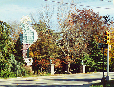 Travellers from the west are welcomed to Mattapoisett by Salty the Seahorse. The 38-foot tall Salty has one light, a blue eye that is eluminated by solar power. (October 2000 photo)