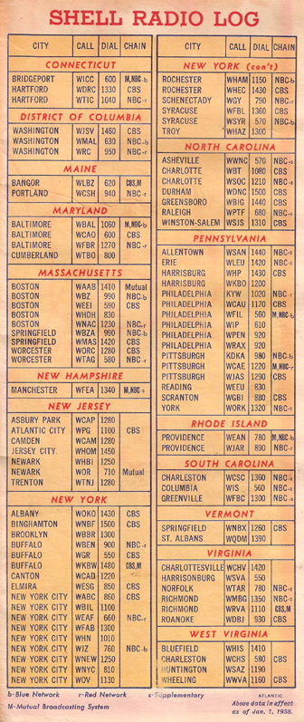 Why was this radio station list included with a 1938 Shell road map of Massachusetts, Connecticut, and Rhode Island? By that year a new phenomenon, and a new form of entertainment, had burst onto the scene for highway travellers--the car radio. Before the Great Depression millions of automobiles and millions of radios had been produced in the United States. But before 1932, no cars had radios. After being developed in the early 1930s, the number of car radios in use surged as the United States drew slowly out of the Depression. According to the World Almanac (1949), their numbers increased to over one million in 34 and to six million in 1938. After World War II, radios became a common feature in cars; over 38 million were in use by 1957. Exploring the AM radio dial to find interesting stations, locally and more distant, became a common sport for highway travellers during the two-lane highway era (and still is for some of us). Local stations provide travellers with an audio place experience, to complement their visual experience as they drive through. Tuning in to more powerful regional stations updates the traveller on happenings in larger cities. Among the more powerful stations--then as well as today--serving daytime listeners along Route 6 in the east are: WWVA Wheeling, KDKA Pittsburgh, WABC New York, WTIC Hartford, and WBZ Boston. Of course, the car-listening adventure increases dramatically at night, when these and other major stations bounce their signals off the ionosphere to distances of hundreds of miles. So, Route 6 travellers east of the Mississippi have drawn on the audio offernings of such AM giants as WSB Atlanta, WLW Cincinnati, WWL New Orleans, WCCO St. Paul/Minneapolis, and KMOX St. Louis. Who could forget the experinence of listening, hundreds of miles away, to the Grand Ole Opry on WSM in Nashville, or the super-powerful Mexican border radio stations such as XERF? |