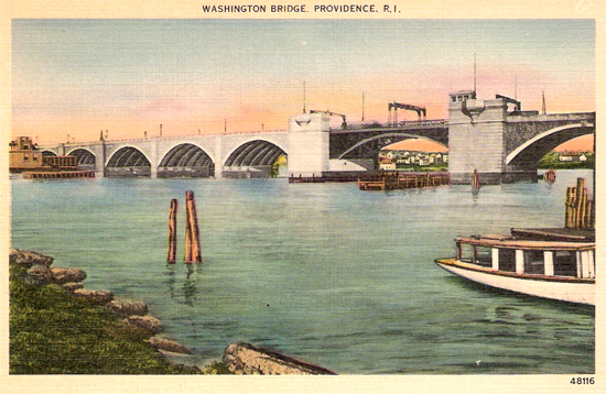 | The above 1930 map shows Route 6 following Waterman Street and crossing the Seekonk River on the Red Bridge. Soon thereafter, the highway moved a bit south to cross the river on the Washington Bridge, and has done so ever since. This massive arch bridge was competed in late 1930 with a double-bascule center span. It had replaced a nineteenth century swing bridge at the site. In 1968 a twin span was added to the Washington Bridge and the bascule center section disabled. Today it carries three U. S. highways, 1, 6, and 44, along with Interstate 195. (Curt Teich Postcard Archives, Lake County Illinois Discovery Museum) | ![]() |