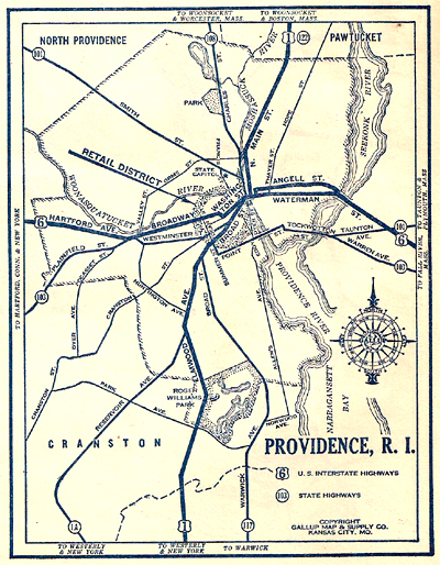 This 1930 Map from Gallup's highway atlas shows the Route 6 path through Providence, well before four-lane limited-access highways were planned. |