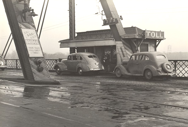This photo was taken by John Vachon in November 1938, when the bridge still charged tolls. It can be found in the American Memory digital archives of the Library of Congress. |