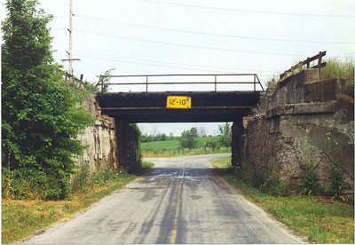 An old stretch of Route 6 passes under the railroad tracks east of Edgerton. (July 1999 photo)